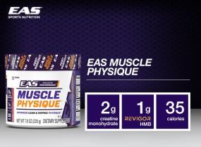 EAS Muscle Physique Powder Features: Contains no banned substances Has 2 grams of creatine to improve body strength and composition Revigor HMB to help build muscle mass, strength, and endurance (studies on adults initiating an exercise program) Use in conjunction with a healthy diet and exercise program Includes one 7.8-ounce canister