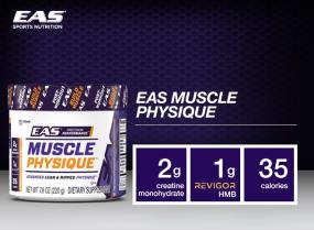 EAS Muscle Physique Powder Features: Contains no banned substances Has 2 grams of creatine to improve body strength and composition Revigor HMB to help build muscle mass, strength, and endurance (studies on adults initiating an exercise program) Use in conjunction with a healthy diet and exercise program Includes one 7.8-ounce canister